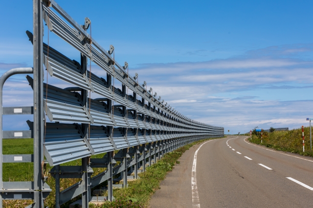 道路脇に設置された板状や格子状の柵は、一見すると単なるフェンスのようです。隙間が空いたフェンスで風をふせげるのかな、と思う方もいるかもしれませんが、実は防雪柵の目的は完全に風を止めるものではありません。風の勢いを弱めて雪を地面に落とすよう設計されており、これにより雪が道路上に吹き込む量を減らします。結果として視界不良の発生を抑え、同時に吹きだまりの形成も防ぐことができます。