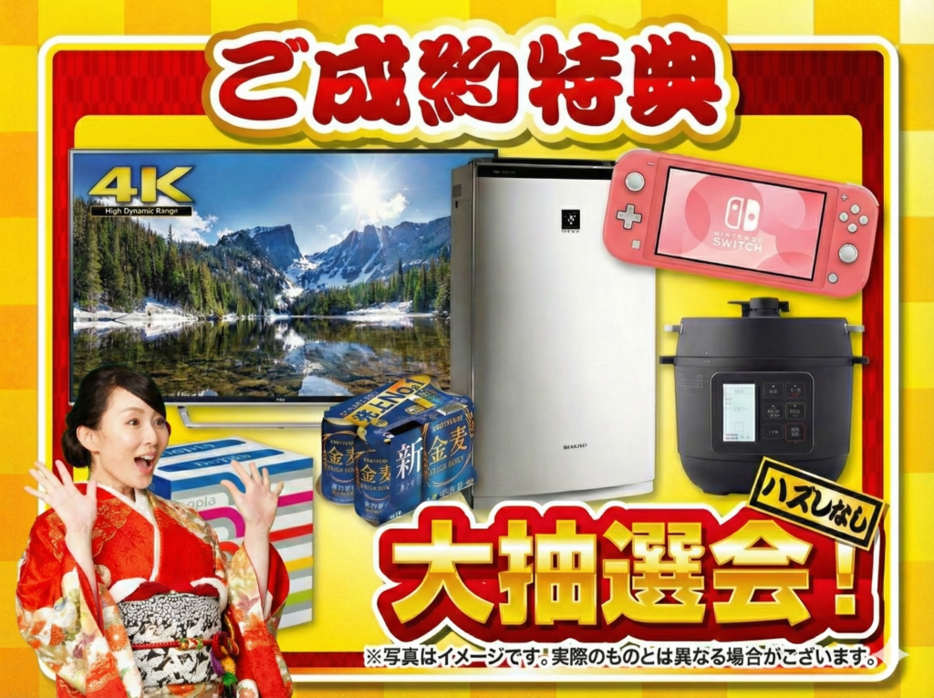 4Kテレビ、任天堂Switch、空気清浄機、ビールなど、豪華賞品が必ず当たります!