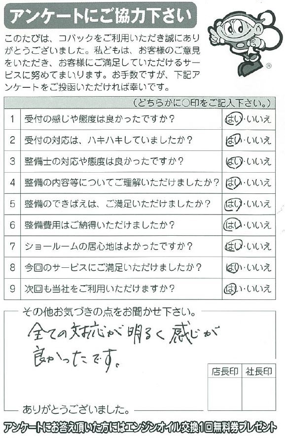 次回車検期限が近づきましたら、ご案内させて頂きます。またお車に関しての不具合・気になる事など、いつでもお気軽にご相談下さい。