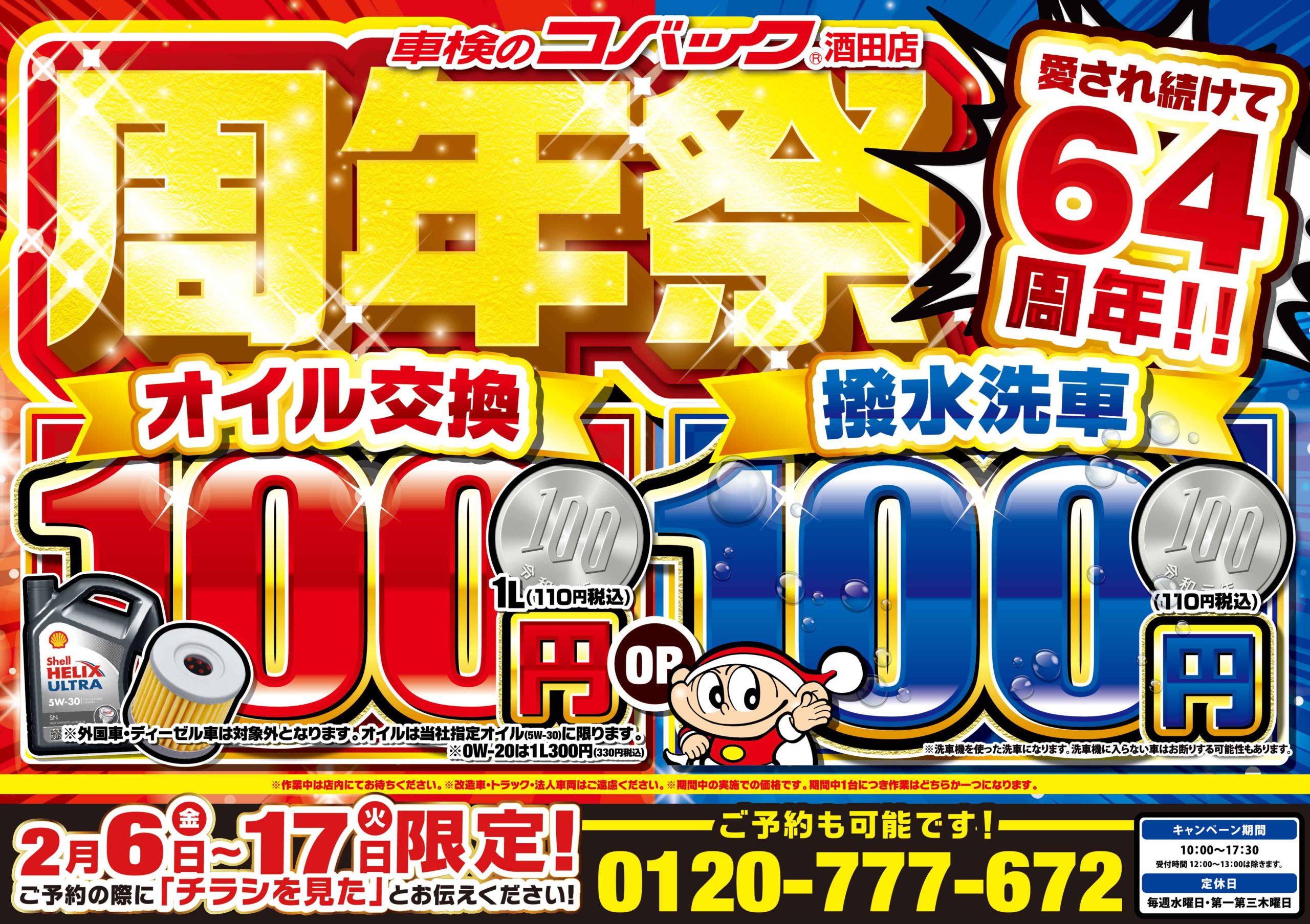 【衝撃の100円!】愛されて64年!コバック酒田店の周年祭が激アツです!【オイル交換 or 洗車】
