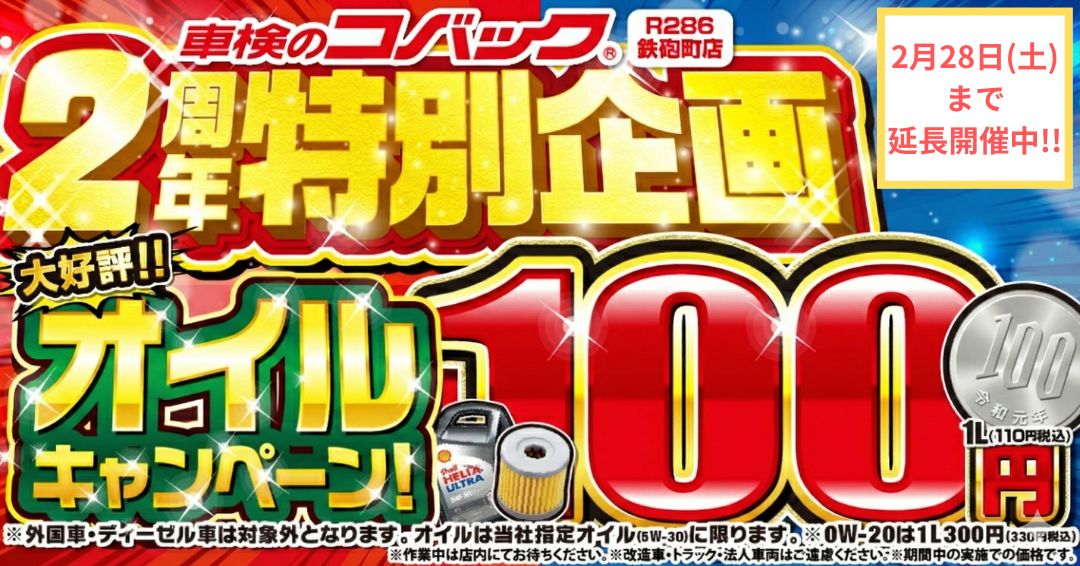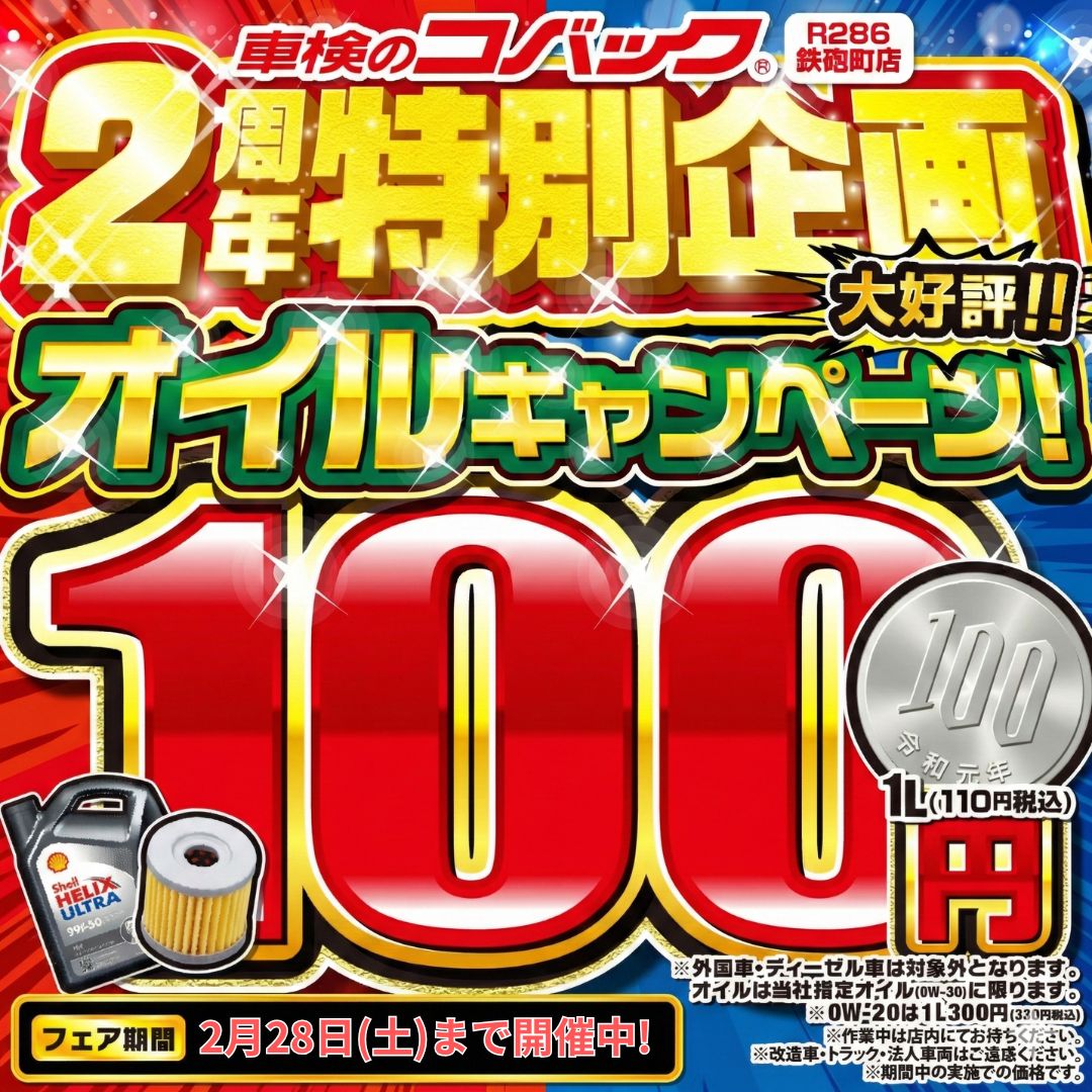 【車検のコバックR286鉄砲町店最新WEBチラシ】!!オイル交換100円キャンペーン!!