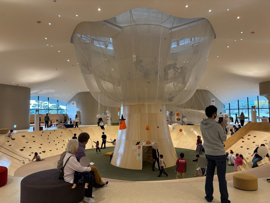 高さおよそ10メートル。巨大なネットでつくられた木のような遊具が天井まで伸び、館内の中心で堂々とそびえ立っています。
