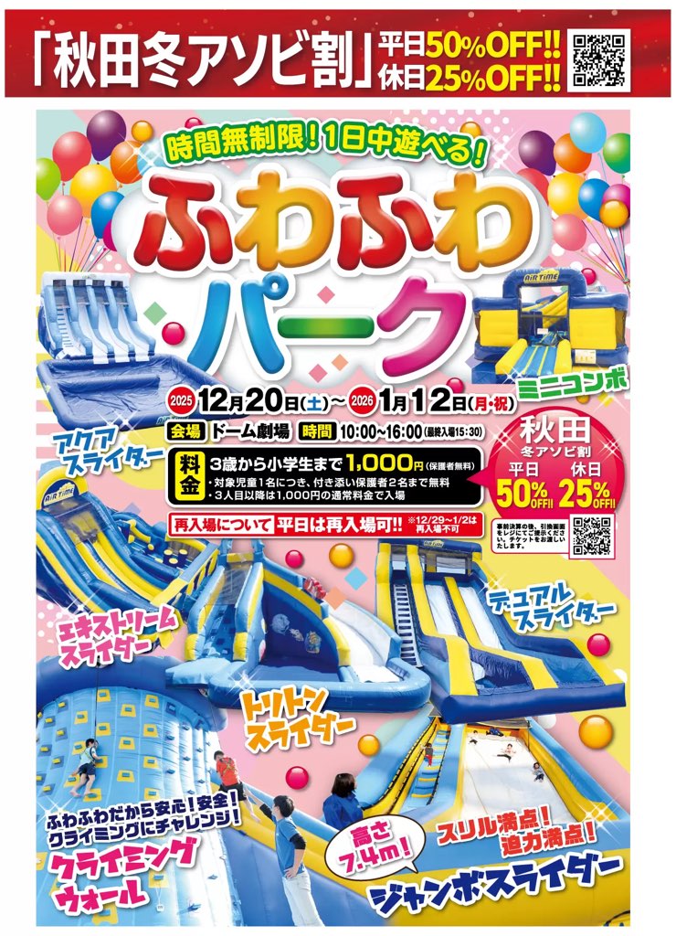寒さが厳しい冬でも、体を動かして遊びたい子どもたちにとって、秋田ふるさと村の「ふわふわパーク」はぴったりのイベントです。屋内ならではの安心感と、時間を気にせず遊べる開放感が合わさり、1日たっぷり楽しめます。