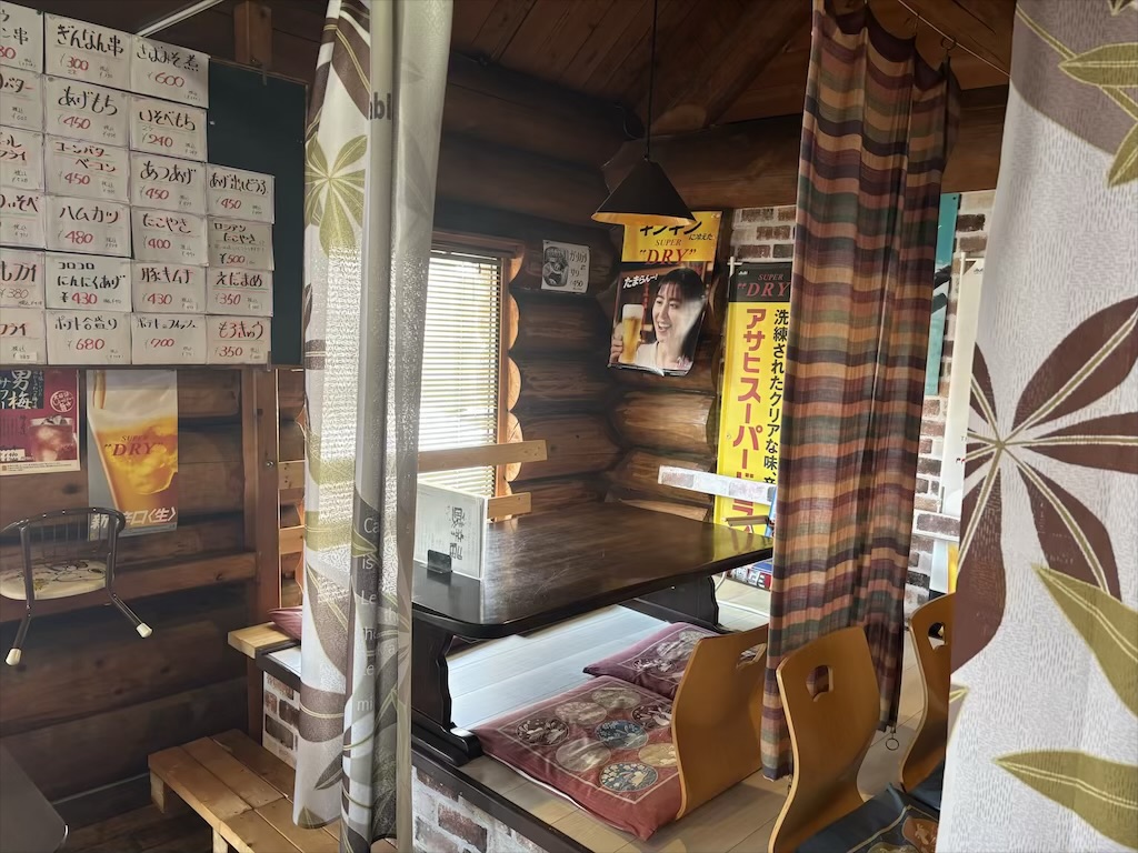 入口左側には4人掛けのテーブル席が2卓あり、さらに小上がり席も2組分用意されています。