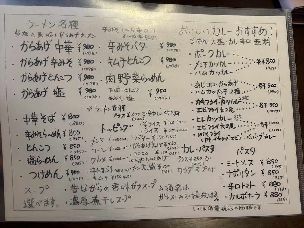醤油・味噌・塩などの定番ラーメンに加え、からあげラーメンや辛味噌ラーメンといったインパクトのあるメニューも揃っています。