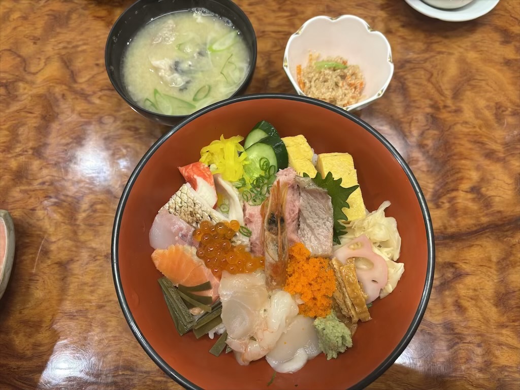丼はネタを2倍盛りに変更できるサービスもあり、しっかり食べたい人にも嬉しい内容です。どの丼にもみそ汁と小鉢が付いており、満足感のあるセットになっています。