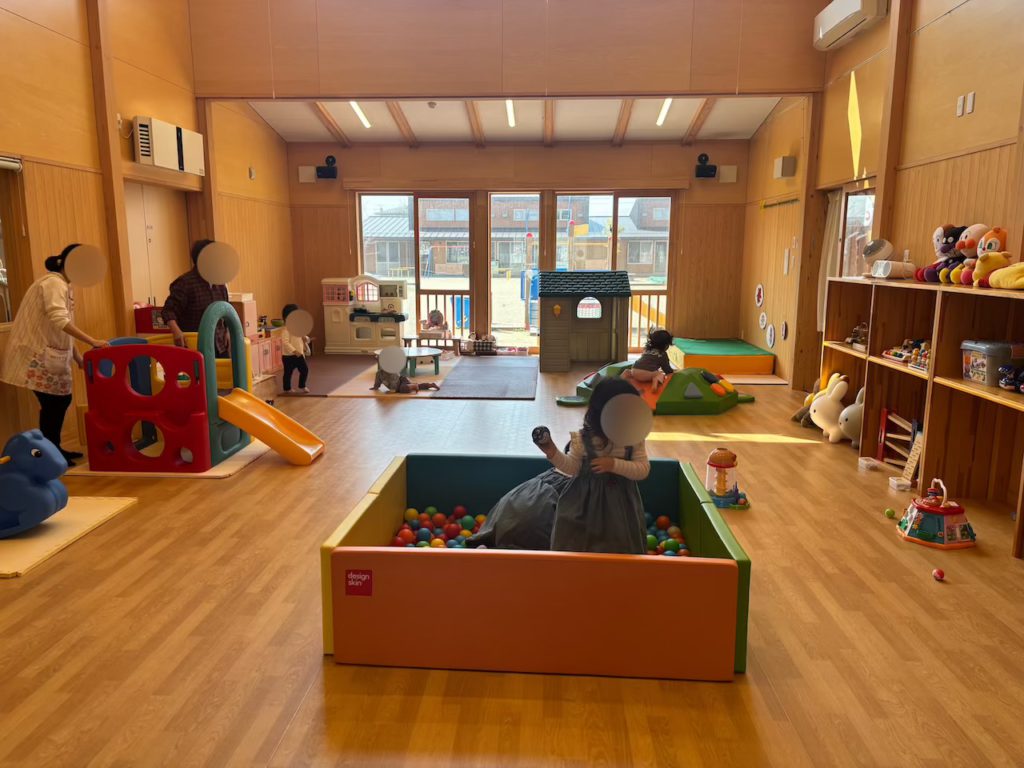 施設に入ってまず感じたのは、天井の高さと開放感です。広々とした空間には、子どもたちが自由に動き回れる遊具やおもちゃがたくさん揃っています。
